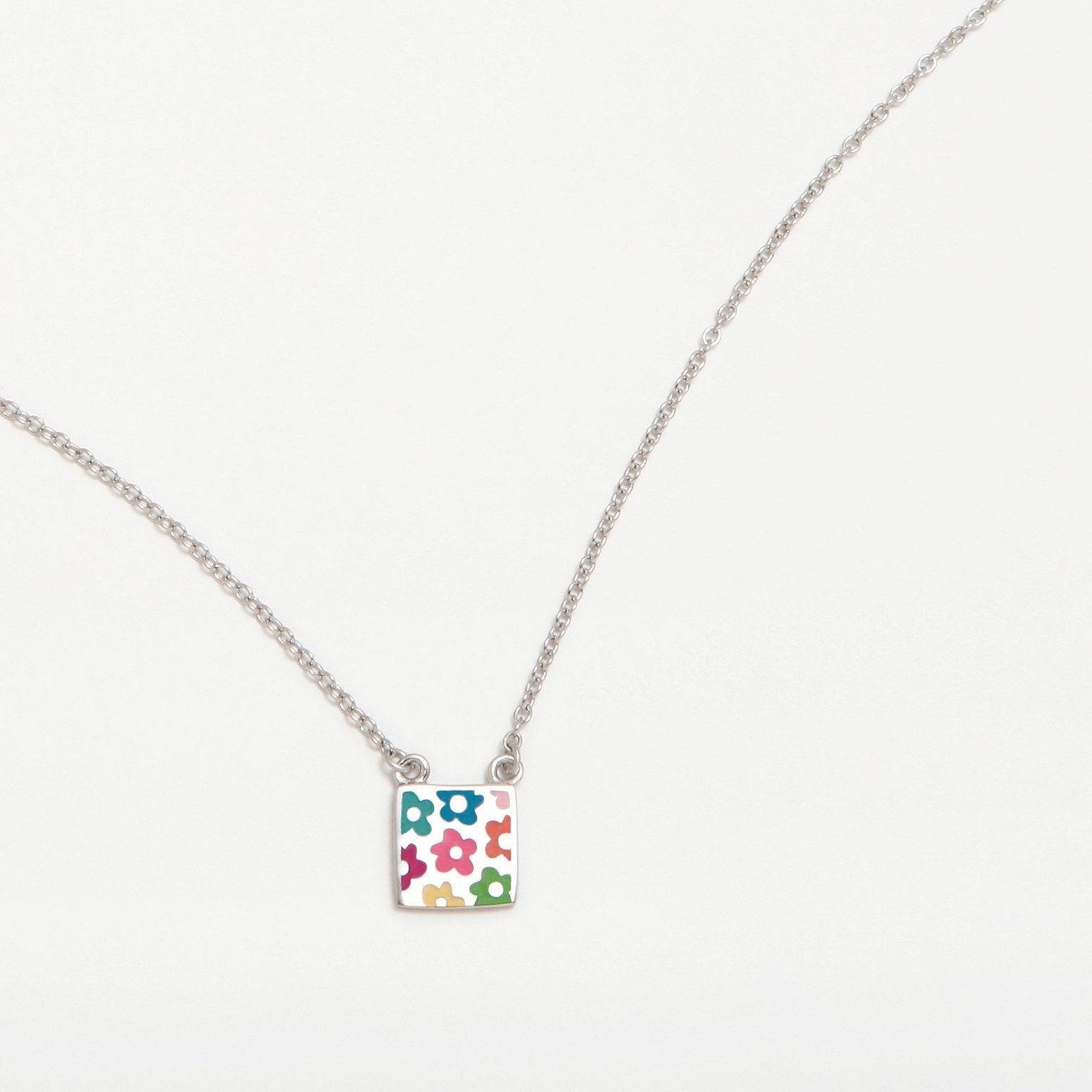 Colgante cuadrado de plata con flores esmaltadas en diferentes colores. Coleccion New Primavera. Pendientes: Por razones de higiene, sólo se admiten devoluciones de artículos rotos o defectuosos de fábrica.